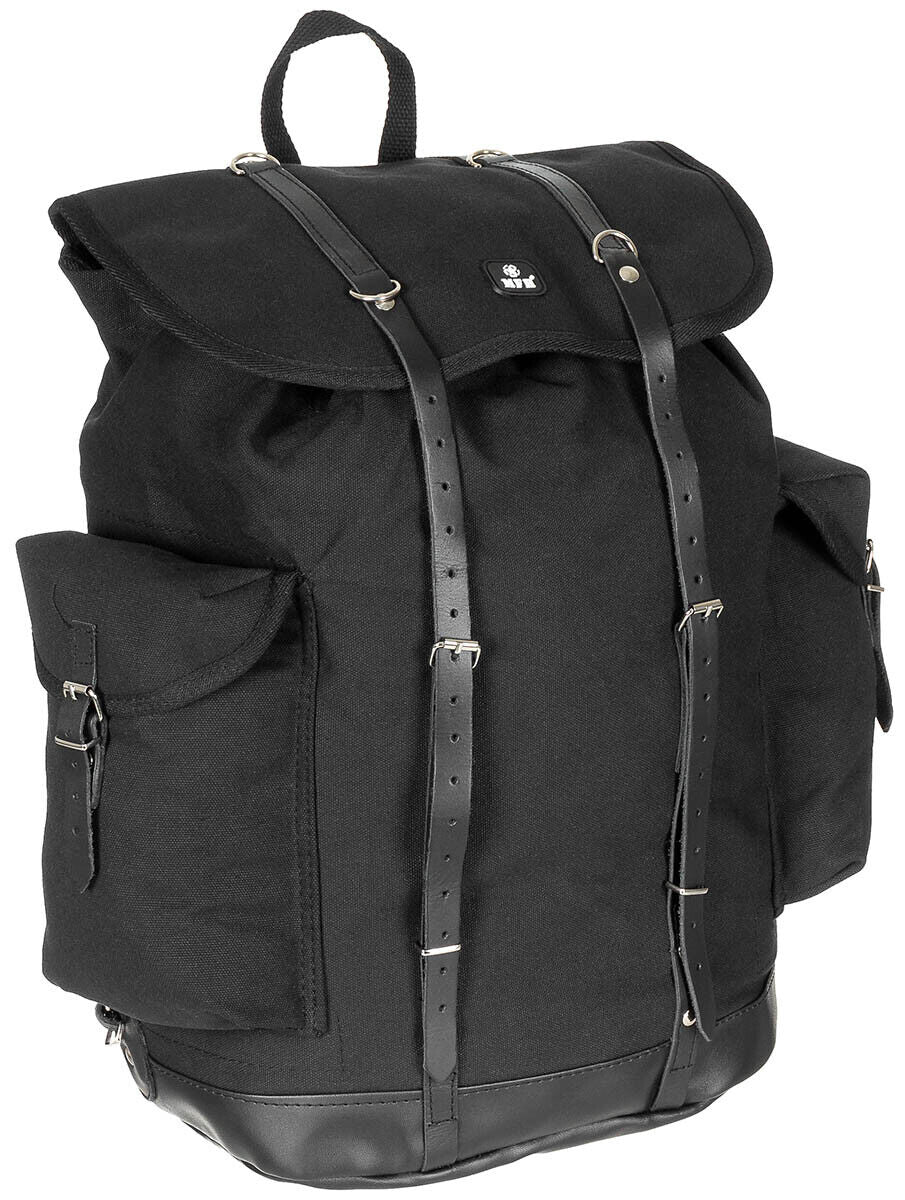 BW Mountain Backpack Black Adjustable Straps Leather Straps and Metal Buckles
